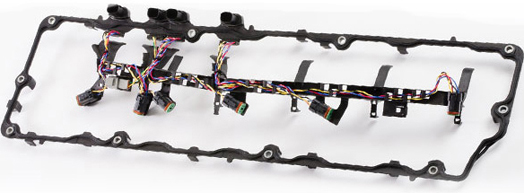 Da die elektronischen Verbindungen vor der Montage der Umgebungsteile fertiggestellt werden, gestaltet sich die Wartung unproblematisch. Mit der „Fenster“-Dichtung werden Stromanschlüsse zur Betätigung von Bauteilen wie etwa Magnetventile, Stellantriebe, Sensoren und Einspritzdüsen bereitgestellt. Jede Verbindung wird geprüft, um die Signalintegrität der einzelnen Stromkreise zu gewährleisten. Die Stromübertragung erfolgt über einen integrierten Kabelstrang.